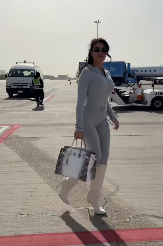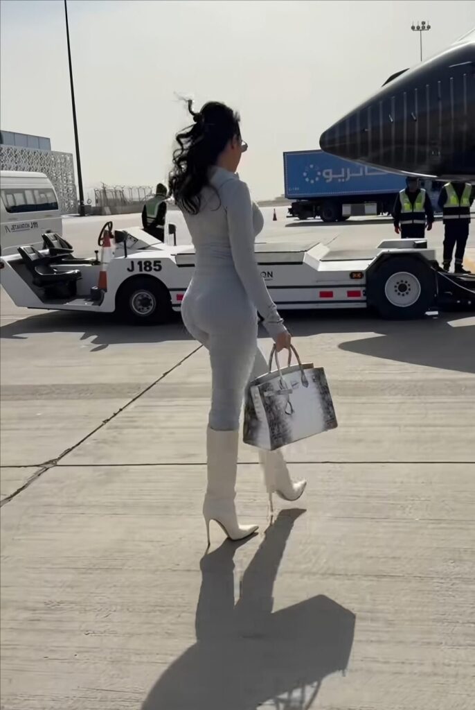 Georgina wore a sleek gray outfit styled with white heeled boots and a matching handbag. She was filmed walking toward a plane, creating a sense of purpose and quiet luxury.